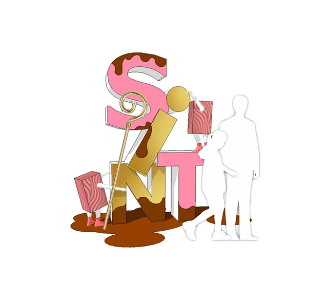 The Sinterklaas campaign was inspired mainly by the sweet-toothed aspect of this celebration of children's patron Sinterklaas. In the weeks around his birthday, Dutch children are treated with candy, chocolate letters and so-called pepernoten. The look and feel of typical Sinterklaas sweets and candy wrappings was combined with the decadent idea of dripping chocolate in order to create a visual language that is happy, festive and colorful. This was then applied to a whole range of communication carriers, from in-store directional signs to gift wrapping papers and animations.